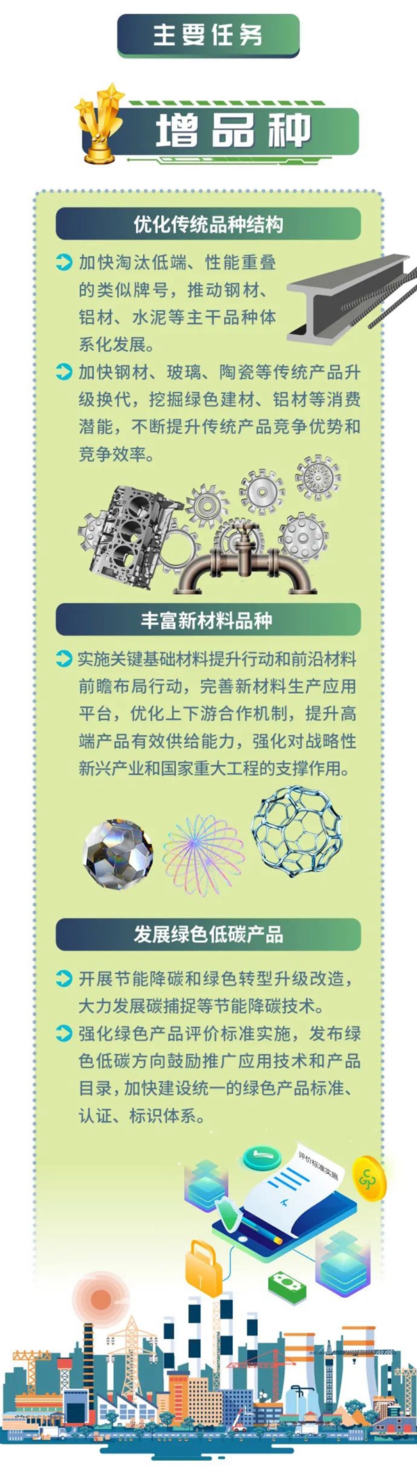 增品種——圍繞建材等行業(yè),開展節(jié)能降碳和綠色轉型升級改造,逐步降低原材料產(chǎn)品單位能耗和碳排放量。
