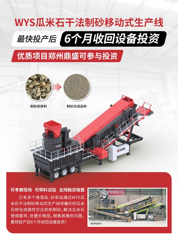 WYS瓜米石干法制砂移動(dòng)式生產(chǎn)線:專門針對(duì)瓜米石等低動(dòng)能、低產(chǎn)率、磨損較大的小骨料制砂研發(fā),將給料料倉(cāng)、帶式定量給料機(jī)、制砂篩分輪胎移動(dòng)站等設(shè)備通過(guò)合理的工藝優(yōu)化組合,將廉價(jià)瓜米石成功轉(zhuǎn)化為優(yōu)質(zhì)機(jī)制砂,具有超快收回投資、超低電耗、超便捷轉(zhuǎn)場(chǎng)等顯著優(yōu)勢(shì),成品機(jī)配合理,細(xì)度模數(shù)可調(diào),符合國(guó)家《建筑用砂》、《建筑用卵石、碎石》標(biāo)準(zhǔn)。