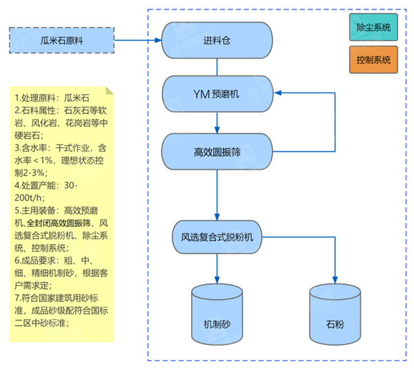 主用裝備瓜米石低制粉全篩分超細破碎機,是專門針對瓜米石等低動能、低產率、磨損較大的小骨料制砂,在現(xiàn)有預磨機的基礎上改良升級的新一代專用整形破碎機。設備采用立式結構,分級破碎工作方式。