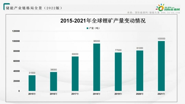 從供應量上看,2021年全球鋰礦石產(chǎn)量約為10萬噸(不包括美國),較2020年的8.25萬噸增長21%。2021年全球鋰資源消費量估計為9.3萬噸,較2020年的7萬噸增長33%。