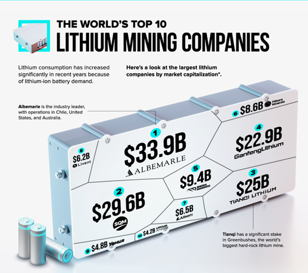 按市值劃分,世界上較大的鋰生產(chǎn)商是美國Albemarle(雅寶),市值達339億美元。Albemarle Corporation與智利第二大生產(chǎn)商Sociedad Químicay Minera de Chile (SQM)合作,在智利的Salar de Atacama開展鋰礦開采業(yè)務。Salar de Atacama自1980年代以來便一直從事鋰礦的開采生產(chǎn),目前占據(jù)了全球近四分之一的鋰礦產(chǎn)量。