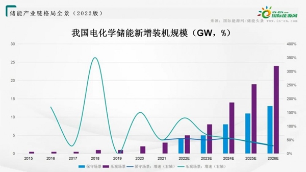 根據(jù)國家發(fā)展改革委、國家能源局發(fā)布的《關(guān)于加快推動新型儲能發(fā)展的指導意見》規(guī)劃,2025年我國將實現(xiàn)新型儲能裝機規(guī)模 30GW 以上,據(jù) CNESA 保守估測,2026年我國新型儲能裝機累計規(guī)模將達到48.5GW,對應2022-2026CAGR為 53.5%。