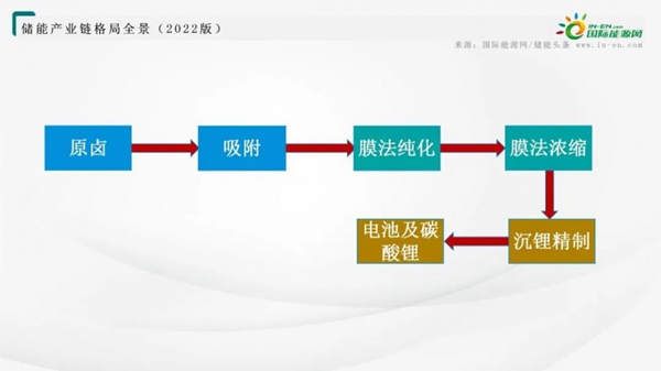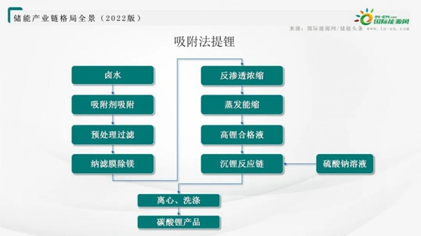 通過對鋰有選擇性的吸附劑吸附鹵水中的鋰,再用淡水解吸與其他雜質(zhì)分離并富集,再通過小型鹽田濃縮后化學沉淀鋰。