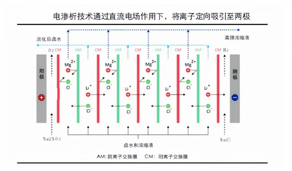 在外加直流電場的作用下,固態(tài)或液態(tài)離子交換膜對水中離子具有選擇性,使水中的一部分離子透過交換膜轉(zhuǎn)移到另一部分水中,從而達到分離鎂、濃縮鋰的目的。其優(yōu)勢在于可處理高鎂鋰比鹽湖、效率高;難點在于開發(fā)具有優(yōu)選擇性、高鋰容量和高穩(wěn)定性的鋰捕獲材料。