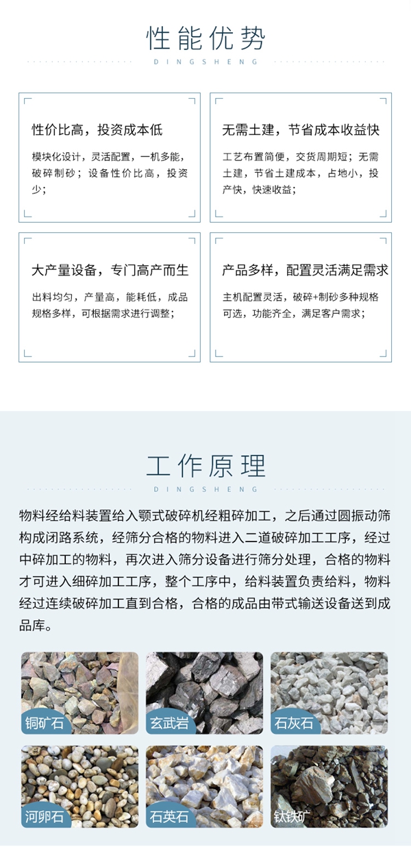 與傳統(tǒng)固定式生產(chǎn)線的安裝方式相比,撬裝式模塊化設(shè)備減少占地,減少土建成本,現(xiàn)場(chǎng)安裝工作量少、安裝周期短,可快速投產(chǎn),具有性價(jià)比高、模塊化設(shè)計(jì)、無(wú)需土建、配置靈活等顯著優(yōu)勢(shì),廣泛應(yīng)用于花崗巖、河卵石、石灰石等各種礦石破碎,建筑垃圾再生利用,鐵路,高速公路,能源,水泥,化工,建筑等行業(yè)。