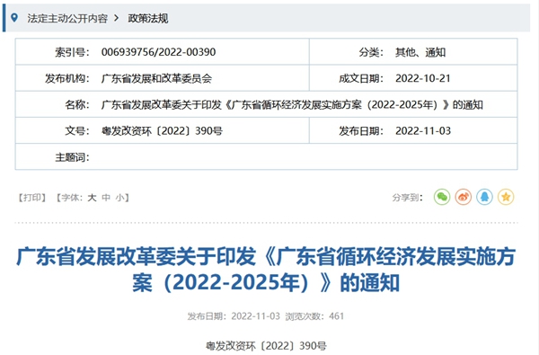 近日,廣東省發(fā)展改革委印發(fā)《廣東省循環(huán)經(jīng)濟發(fā)展實施方案(2022-2025年)》(以下簡稱方案),對廣東省大力發(fā)展循環(huán)經(jīng)濟,推進資源節(jié)約集約利用,構建資源循環(huán)型產(chǎn)業(yè)體系和廢舊物資循環(huán)利用體系,對保障資源安全,推動實現(xiàn)碳達峰、碳中和,促進生態(tài)文明建設具有重大意義。