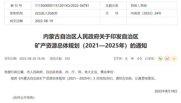 近日,內(nèi)蒙古自治區(qū)人民政府印發(fā)《內(nèi)蒙古自治區(qū)礦產(chǎn)資源總體規(guī)劃(2021—2025年)》,提出到2025年,重要礦產(chǎn)的供應(yīng)保障體系更趨完善,勘查開發(fā)區(qū)域布局更趨合理,礦產(chǎn)資源勘查開發(fā)與環(huán)境保護(hù)更加協(xié)調(diào),基本形成綠色勘查開發(fā)新格局。